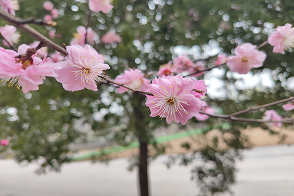 “最是一年春好處,櫻花爛漫共此時?!痹谒奚釄@區(qū)這一隅,桃花、櫻花悄然綻放、開滿枝頭,粉如霞、美如畫,與藍天白云相映襯,勾勒出一幅粉色的春日畫卷。