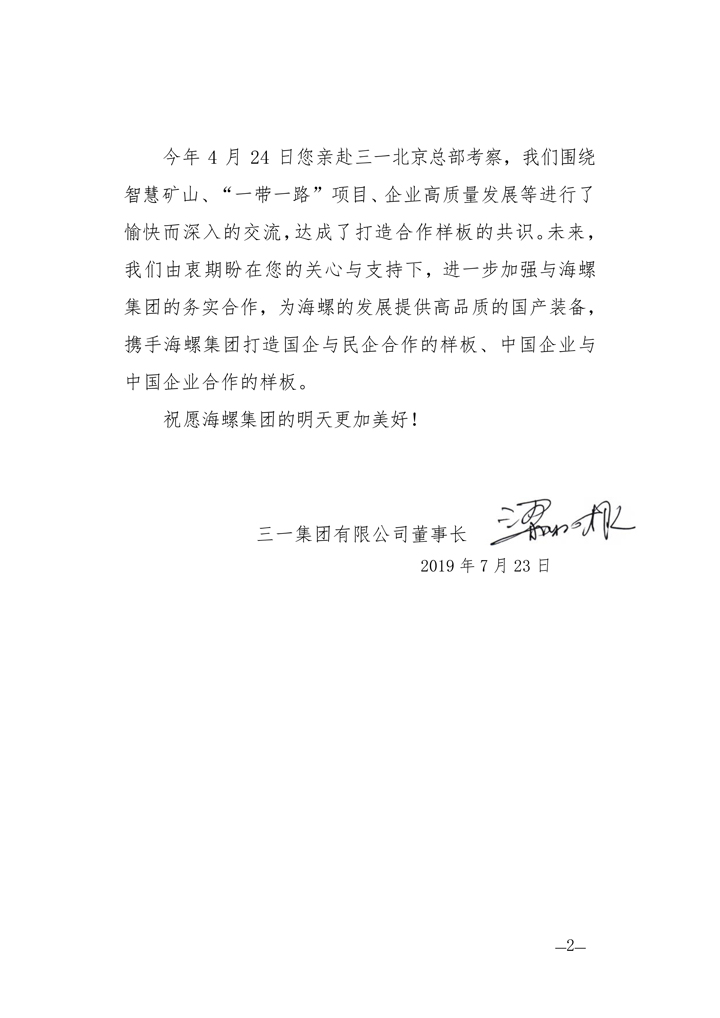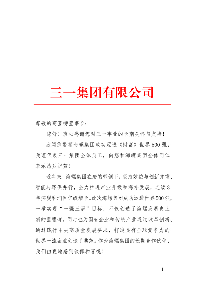 三一集團(tuán)董事長(zhǎng)梁穩(wěn)根致高登榜賀信